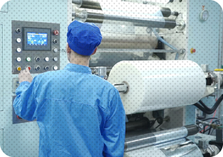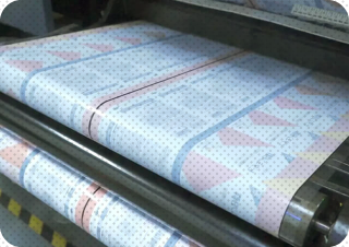 ラミネート完了後の素材を製袋機械にセットし、素材を袋の形に加工します。